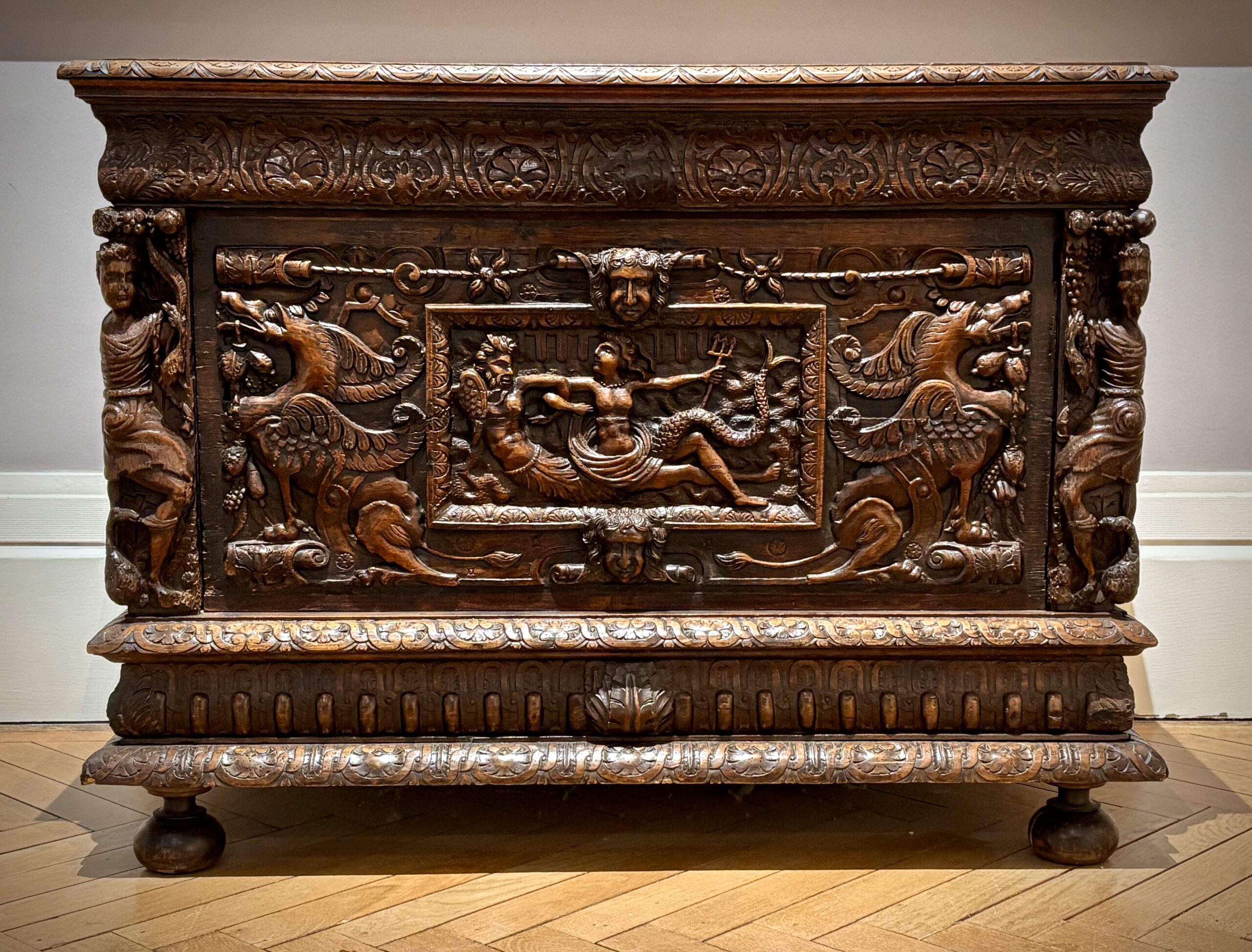 Manon Painteaux s’empare du Coffre aux Cariatides, orné d’une représentation de Neptune et d’un Triton entre deux chimères. L’artiste y voit moins une scène narrative qu’un terrain de transformation visuelle, un motif ancien à faire glisser vers un langage contemporain.
