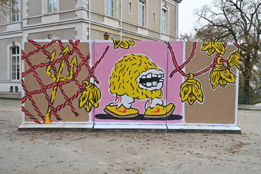 Manon Painteaux adopte une approche graphique, marquée par des formes exagérées et ludiques aux couleurs vives. Ses personnages ou objets, souvent représentés avec des éléments déformés ou abstraits, évoquent un univers surréaliste, rappelant un mélange entre le graffiti, la bande dessinée et une influence de l’art pop.