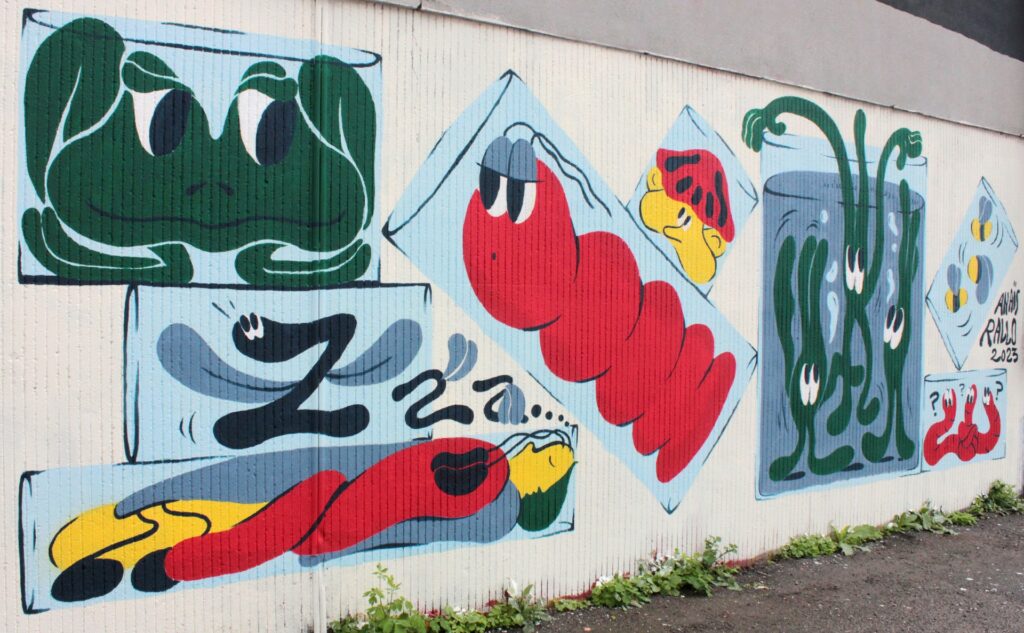 À travers ses compositions, Anaïs Rallo s’applique à mettre en scène des narrations visuelles qui déjouent les évidences du quotidien. Sur chaque support viennent s’esquisser éléments naturels, personnages cartoonesques, objets personnifiés et chimères botaniques dans un style graphique rond et mouvementé.