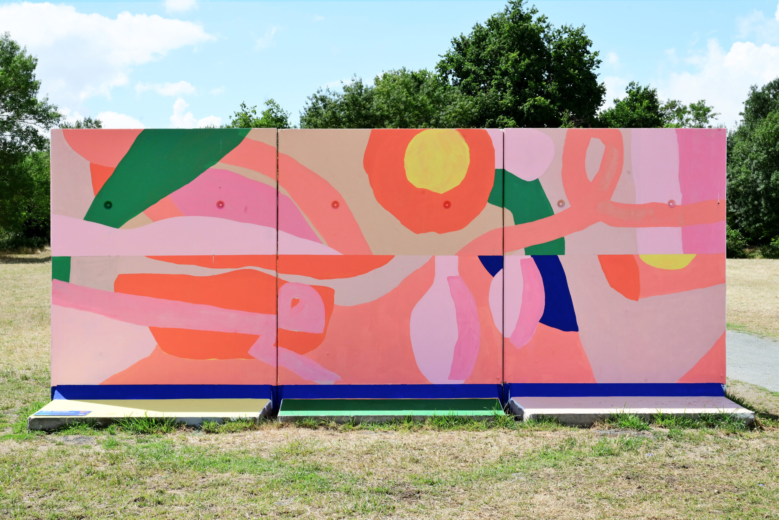 « J’ai choisi Plein Champ pour expérimenter un univers plus abstrait, plus rythmé, vers lequel j’ai envie de m’orienter. Dans cette perspective, j’ai peint deux paysages de campagne que j’ai réunis, en laissant place à une interprétation libre des formes, en écho à l’environnement du festival. J’y exprime une forme de liberté à travers le geste et les couleurs vives. »