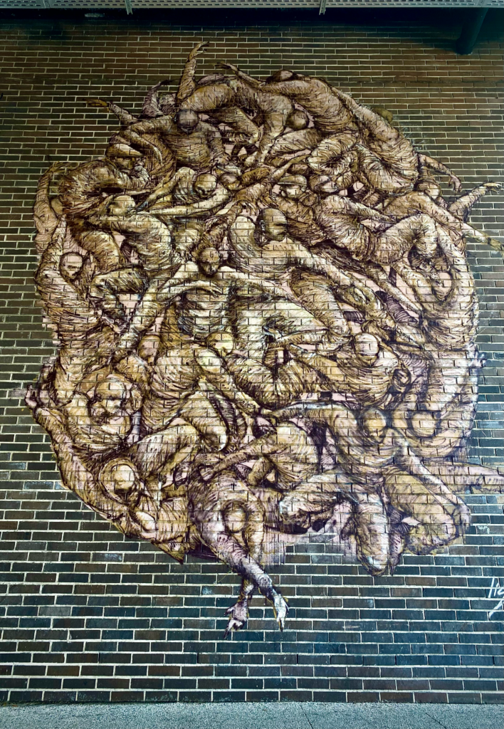 Ses fresques mettent en scène des silhouettes et visages inspirés de la vie urbaine. Son approche renforce la visibilité des individus dans la ville tout en proposant une écriture visuelle contemporaine, accessible et durable dans le paysage urbain.